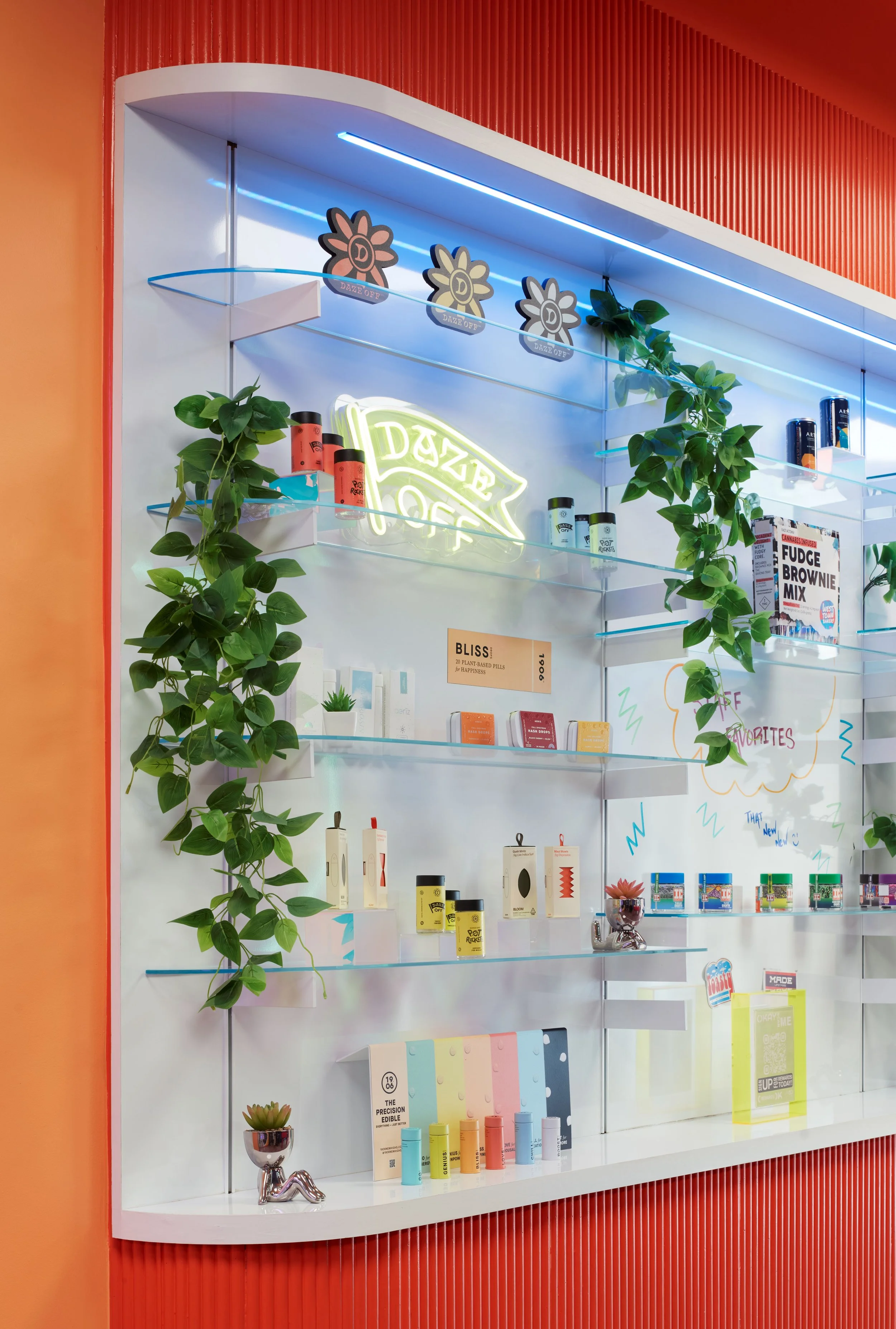 At OKAY Cannabis in Chicago, Vero transformed the retail space with meticulously crafted, custom-engineered display tables in eye-popping colors. The tables feature operable tops, providing both functionality and aesthetic appeal. The store boasts painted metal panels framed with rich wood, seamlessly blending industrial and natural elements. Vero also designed and installed backloaded cannabis display cabinets, enhanced with custom lighting details that highlight the products beautifully. An adjustable shelving system further complements these cabinets, offering flexibility and ease when the merchandise needs to be refreshed or rearranged.